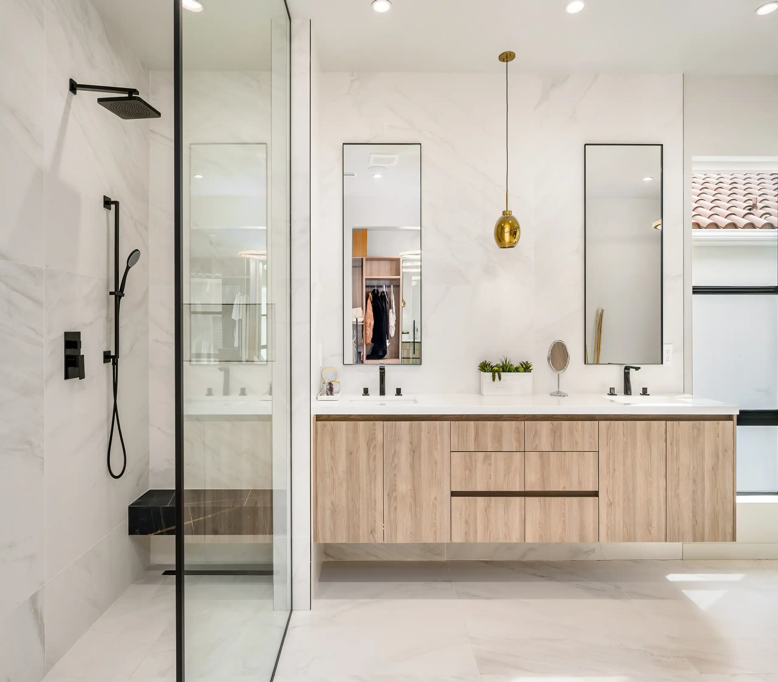 Maximize storage and convenience with wall-mounted vanities, recessed shelving, and space-saving layouts. High-end materials like quartz countertops and ceramic tiles ensure durability, while touchless faucets, heated flooring, and rainfall showers elevate comfort. Our expert team delivers custom modern bathroom remodels tailored to your style and budget.